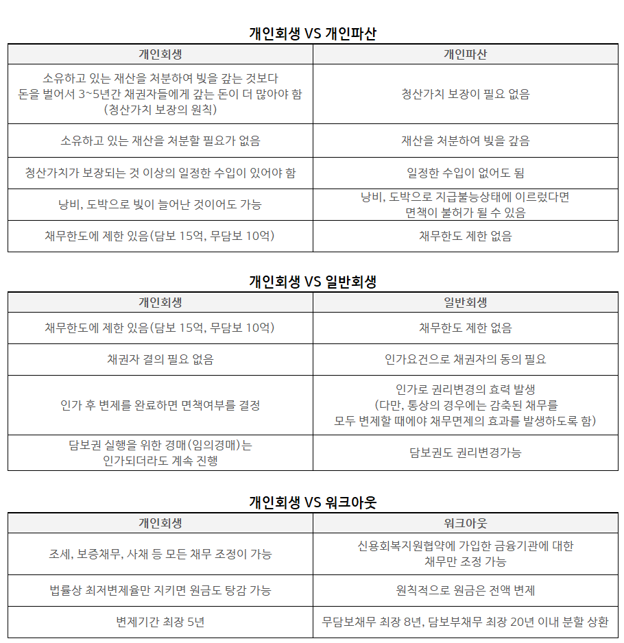 3. 개인회생과 일반회생, 개인파산, 워크아웃 비교